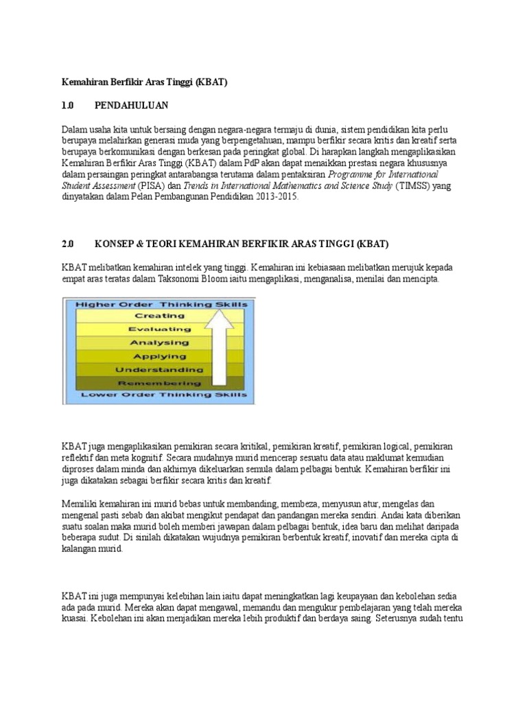 Sorotan Kajian Kesediaan Dan Keperluan Guru Bahasa Melayu Dalam Pelaksanaan Kemahiran Berfikir Aras Tinggi KBAT Di Bilik Darjah November 2018 DOI. Kesediaan Guru dalam Pelaksanaan Kemahiran Berfikir Aras Tinggi KBAT Dalam kajian mengenai kemahiran berfikir aras tinggi King et al. Kemahiran berfikir aras tinggi berpandukan teori taksonomi Bloom melibatkan tiga aras tertinggi iaitu menganalisis menilai dan mencipta manakala kemahiran berfikir aras.